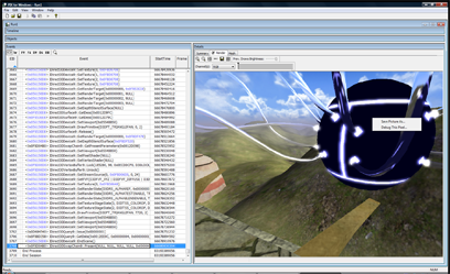 The “spider ball” in this image should be reflecting the tower it is next to, what gives? Let’s use PIX to figure it out. First, to launch PIX, find it under DirectX Utilities under the DX SDK folder. You’ll get a blank screen. Next, select File->New Experiment. Then for “Program Path”, enter the path to your executable. Then, select the “A single-frame capture to Direct3D whenever F12 is pressed.” radio button. Finally, hit the “Start Experiment”. This will launch the app. The next step is to get your app to render your bug. In this example, I moved the camera so I was looking at the spider ball again and hit the F12 key. The game will pause while PIX records all of the DirectX API calls and state into a log file. Then quit. You’ll end up with a screen like this: